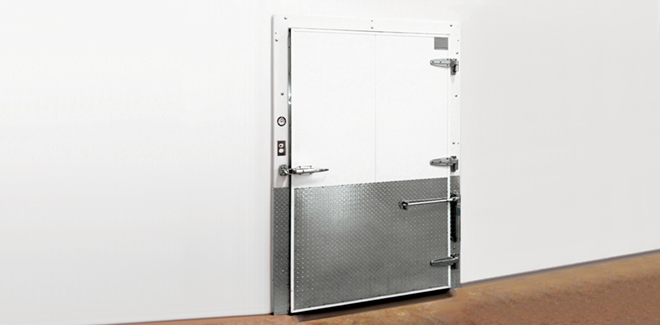 Eco-Cold swinging low-temperature doors provide maximum sealing for both new and replacement applications. Suitable for interior and exterior use, they come in single or double panels with various options, including panic hardware.